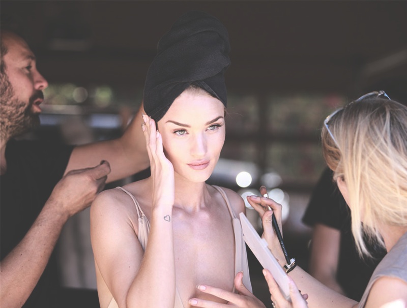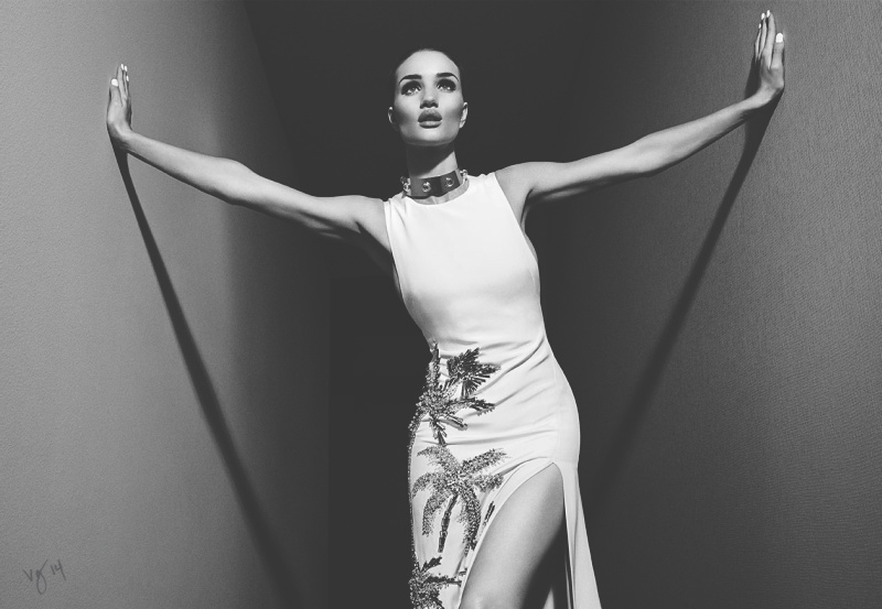 THERE IS NOTHING MORE GLAMOROUS than a photo shoot in the Palm Desert home of none other than Hollywood’s biggest producer – Jerry Weintraub. When this includes supermodel Rosie Huntington-Whiteley, known to her friends as Rosebud, dressed in a sleek black leather trench coat with a red lip, a vintage Yves Saint Laurent chiffon dress with matching pastel pink makeup, and a black turban accessorized with diamonds and a vanity mirror, there really is nothing more to wish for. Not only is Rosie’s inimitable beauty accentuated by the numerous ensembles she wears, but also by the immaculate makeup applied, all of which seems to fit in seamlessly with every backdrop of Jerry’s home, which Rosie calls a “desert dream.” Of course, the photo shoot couldn’t be complete without the reminiscences of someone as legendary as Weintraub. What he shared, according to Rosie, were “stories about Frank Sinatra, that one late-night call from Marilyn, and how he came to be one of Hollywood’s biggest producers.”