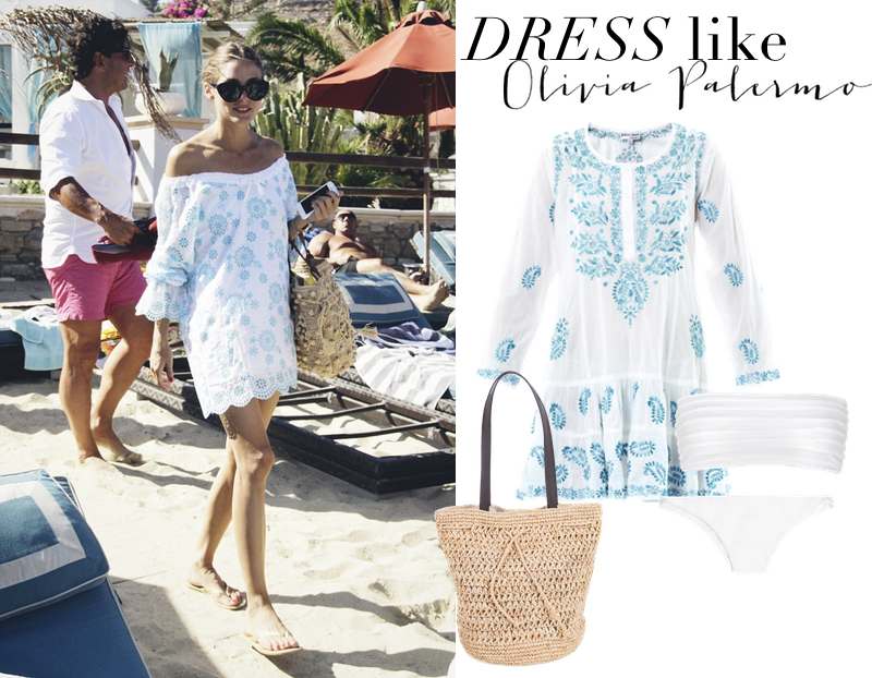 Olivia Palermo‘s frequent getaways to beachside towns with her husband have given her an incredible ability to select the best cover-ups and beach totes. Emulate her style with an embroidered cotton kaftan, a straw bucket bag, and a white bikini (briefs and top)