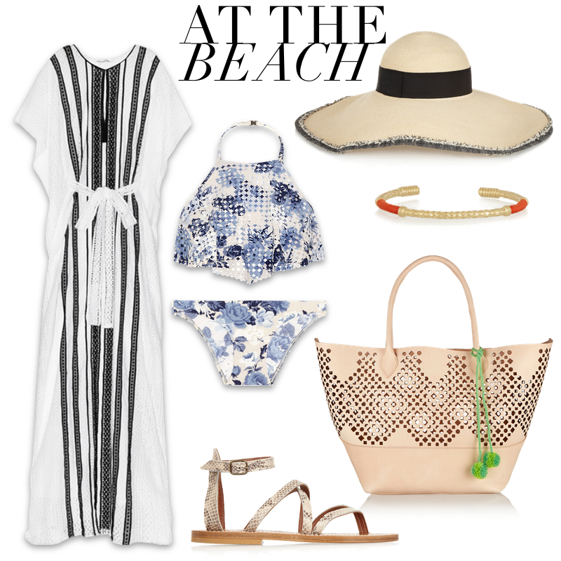 A day at the seaside calls for an intricately crocheted cotton Oscar de la Renta Kaftan, a Zimmermann two-piece, an Eugenia Kim wide-brim hat, some leather sandals, a laser-cut tote, and of course, an Aurélie Bidermann bangle.