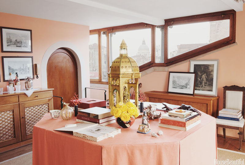 [images : Designer Michael White’s home in Venice; octagonal library table draped in Brunschwig & Fils Toile Sauvageonne, with trim by Samuel & Sons via one & two]