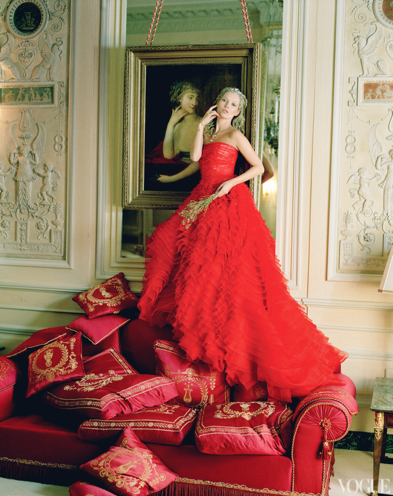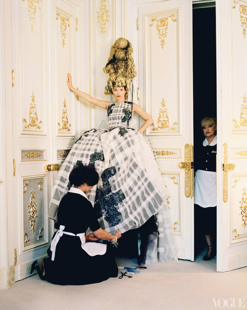 OPULENCE, SPLENDOR, REFINEMENT, are what Kate Moss exudes in my favourite Tim Walker editorial. In the palatial Ritz in Paris, where the gilded interior combines with high ceilings, impossibly ornate wall mouldings and exquisite chandeliers that reflect morning light in a graceful and arresting manner, Kate is nothing short of a modern-day Marie Antoinette. She lounges in the lavish peach and gold-coloured Imperial Suite, with a gold framed baroque mirror and a four-poster bed said to be identical to that in Marie Antoinette’s bedroom in the Château de Versailles, dressed in an embroidered organza flower coat by Chanel, with dozens of Chanel boxes and shopping bags by her side. She wears full-skirted haute couture gowns by Alexander McQueen and Dior, and large headpieces by Julien d’Ys, in rooms overlooking Place Vendôme.