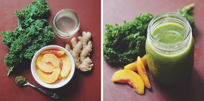 Just a little healthy smoothie recipe for quick weekend detoxing after over-indulging over the holidays . . . Peach Ginger Kale Protein Smoothie Makes 1 serving Ingredients: 1 cup frozen peaches 1 cup kale 1 cup coconut water 1 tbsp chopped ginger 2 tbsp hemp protein powder [recipe & images : free people via women.com] 1