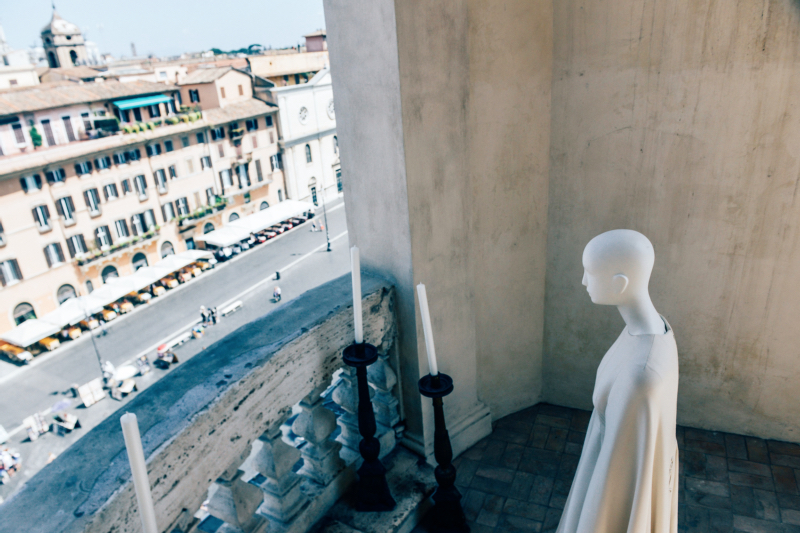 FASHION AND CULTURE REMAIN INEXTRICABLY INTERTWINED in the house of Valentino, a fact proven at the elaborate set up of the Fall 2015 couture collection. Not only were guests treated to an alfresco fashion show in the legendary Piazza Mignanelli — where Valentino himself would set his fashion shows, with locals peeking from their windows and the sunset painting the square in a golden light — but the whole of Rome was transformed into a museum of the fashion house. The day before, Valentino dresses were placed throughout secret landmarks in the city, coming as a delightful surprise to the attendees. The combination of beautifully intricate gowns and the historical heritage they were set in made for beautiful photographs, and also showed the extent to which Maria Grazia Chiuri and Pierpaolo Piccoli are inspired by the grand city. After all, you can take Valentino out of Rome, but you can’t take Rome out of Valentino.
