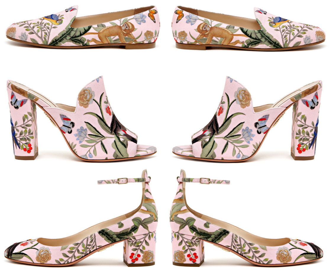 According to Aquazzura’s founding designer, Edgardo Osorio, “I love interiors and I’ve always loved de Gournay wallpapers. The way I met them is that I have a room in de Gournay wallpaper at my house that was shot by a magazine, and they called me and said we should do something together … I’m obsessed with what they do, everything is customizable, everything is hand-painted. I’m Colombian, I love everything exotic, so I thought, why don’t we make a pink jungle.”