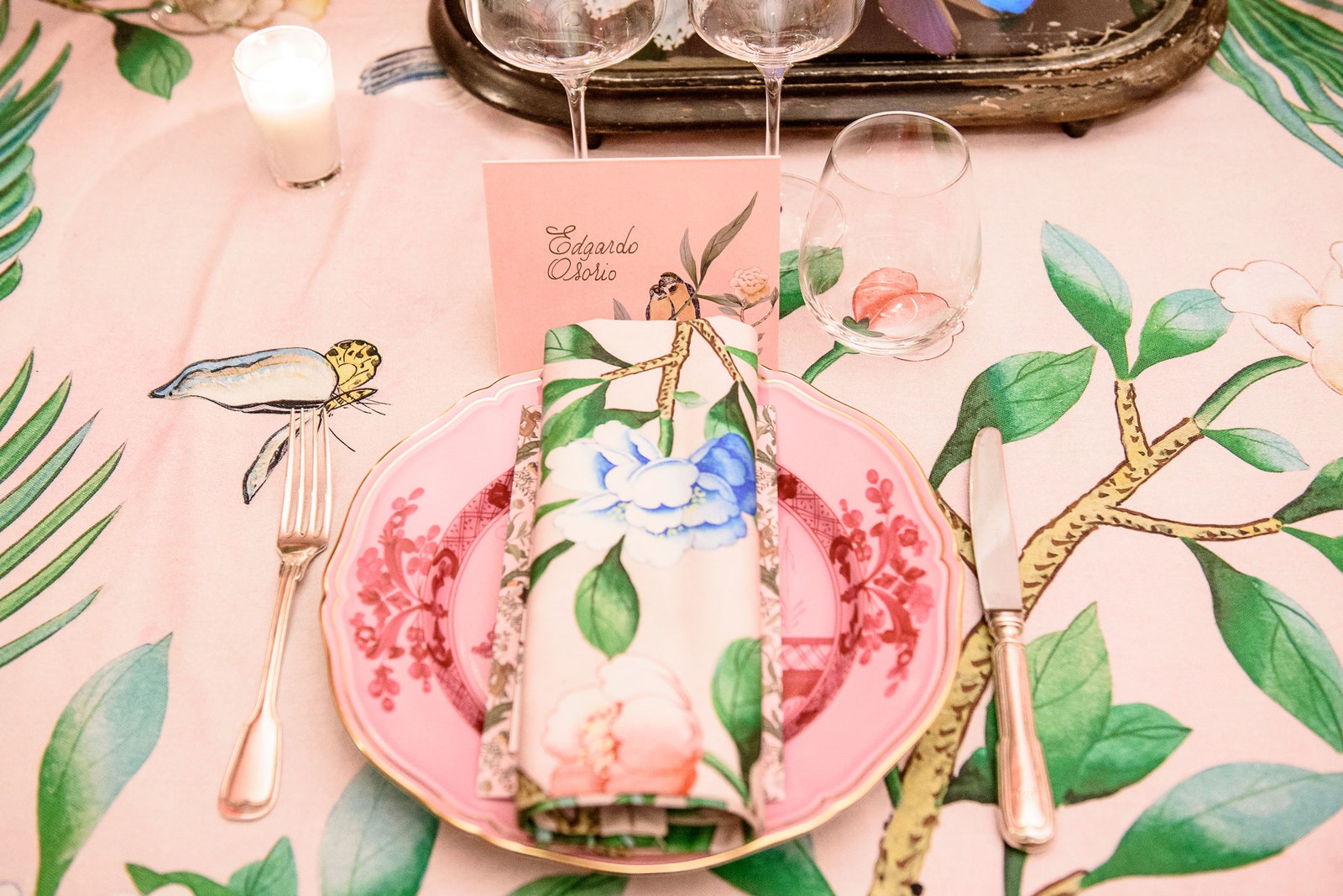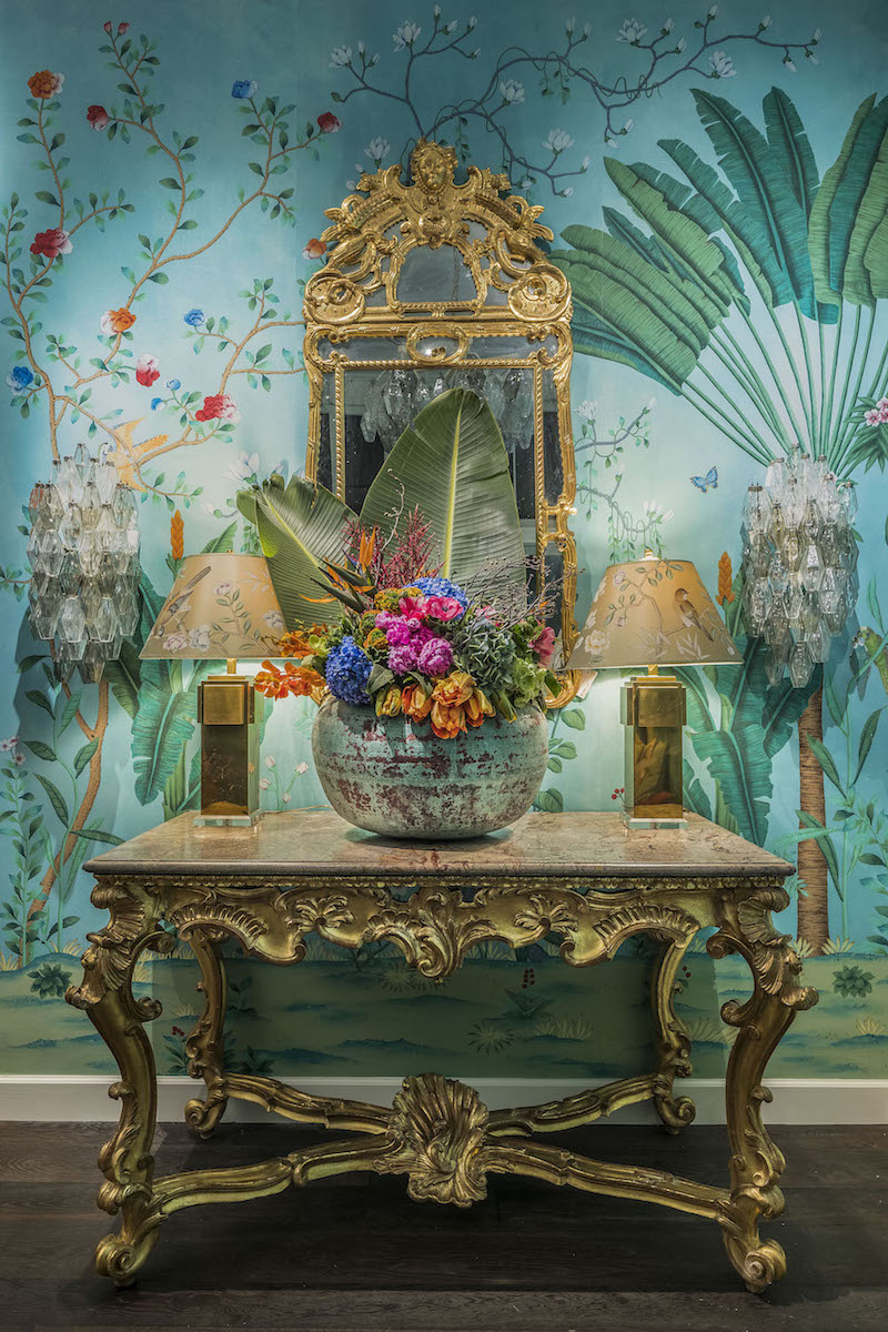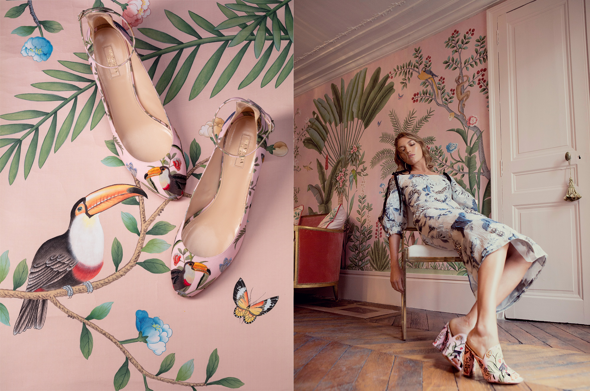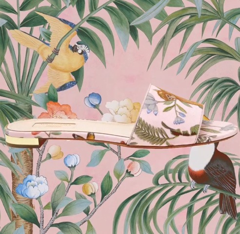 According to Aquazzura’s founding designer, Edgardo Osorio, “I love interiors and I’ve always loved de Gournay wallpapers. The way I met them is that I have a room in de Gournay wallpaper at my house that was shot by a magazine, and they called me and said we should do something together … I’m obsessed with what they do, everything is customizable, everything is hand-painted. I’m Colombian, I love everything exotic, so I thought, why don’t we make a pink jungle.”