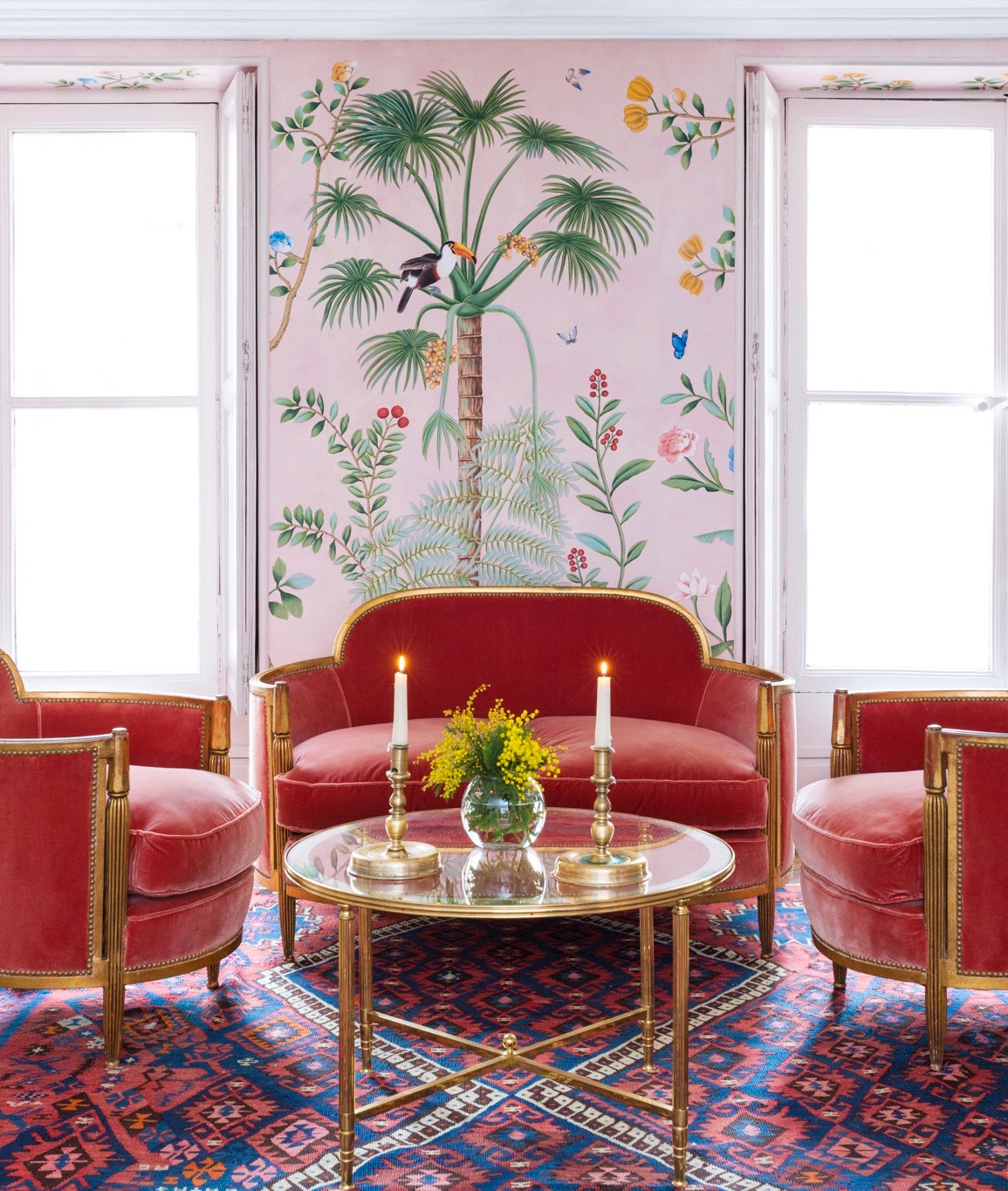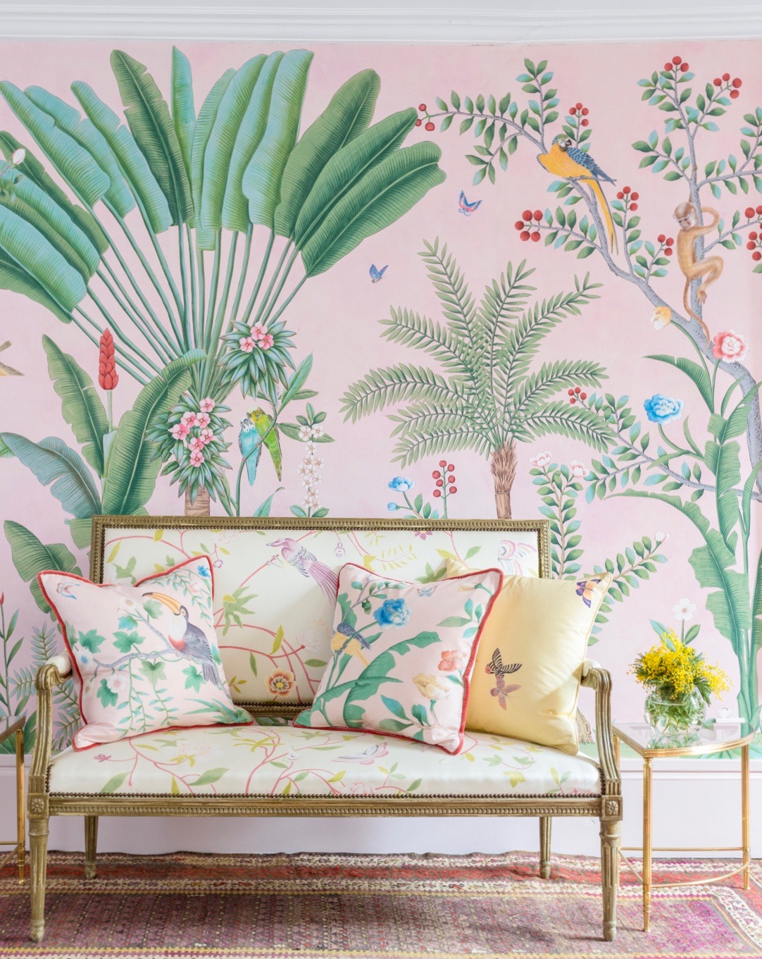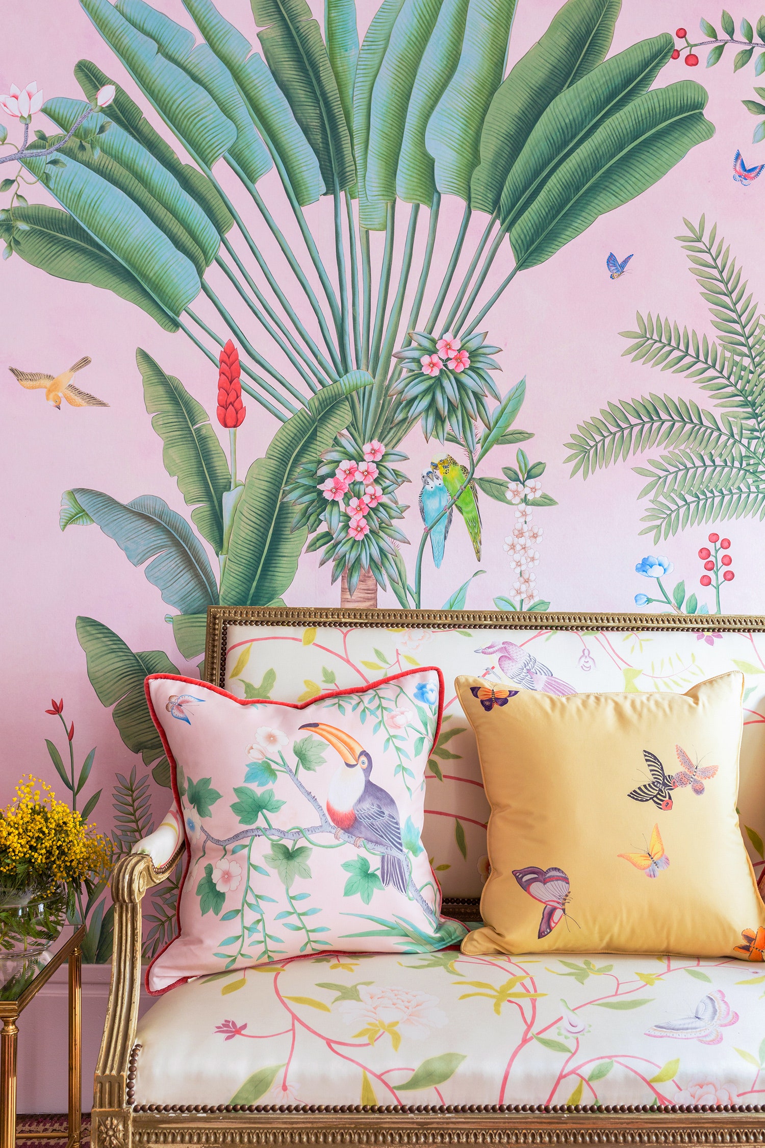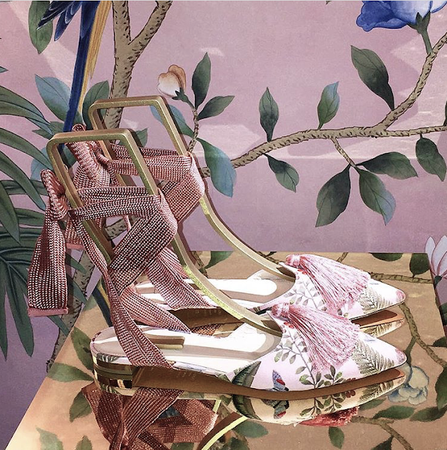 IF YOU ARE A LONGTIME READER, you will know that here at This Is Glamorous, we are a little obsessed with Chinoiserie and with de Gournay in particular (see here). And as the story goes, the company was started by a young accountant in 1984, who was trying to restore some antique wallpaper in his family home and ended up not only forging, but dominating a niche in the high-end décor market. Always innovating, the company has recently teamed up with shoe label Aquazzura to create a new pattern which they called Amazonia, a design in standard design colours on custom pink painted Xuan paper.