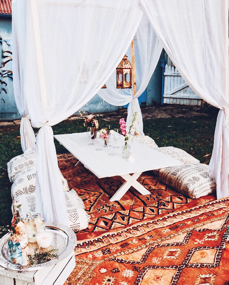 SUMMERTIME IS NEARLY HERE, which means long, loungy days spent in the hazy sunlight, dining en plein air, and doing just about everything outside. When we happened upon Byron Bay-based Lisa Smith’s Instagram (@lisadanielle__) shot of a woodsy table set beneath fairy lights and amongst flicker Moroccan lanterns, worthy of forest nymphs and we were completely swept up in the Bohemian romance of it all. She shares a few other scenes strewn with Moroccan rugs and cushions and that turn summery back gardens into a kind of fairyland …