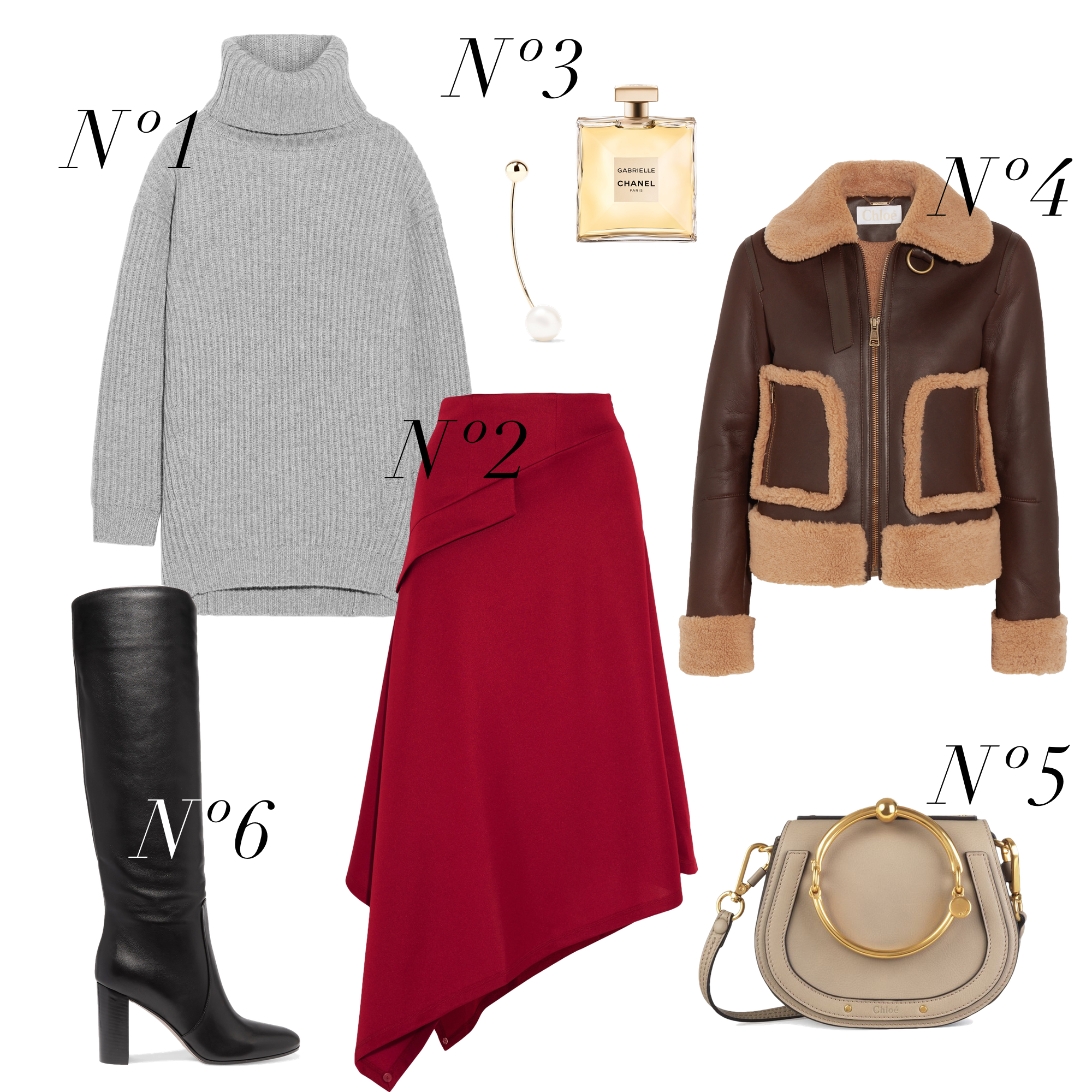 Nº1 – Acne sweater, Nº2 – J.W.Anderson skirt, Nº3 – Sophie Bille Brahe earring & Chanel Gabrielle Eau de Parfum, Nº4 – Chloé shearling jacket, Nº5 – Chloé Nile bag, Nº6 – Gianvitto Rossi boots