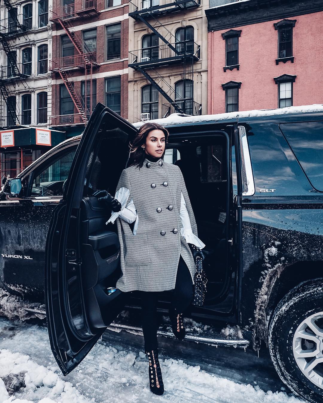 Annabelle Fleur (@vivaluxuryblog) pairs a plaid cape with black cigarette pants and a fluttery white blouse for winter days.