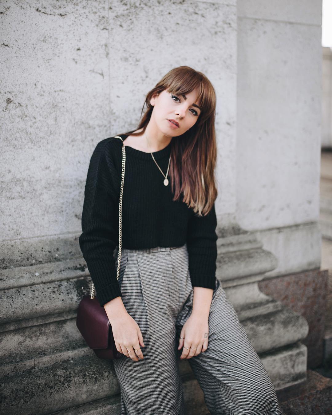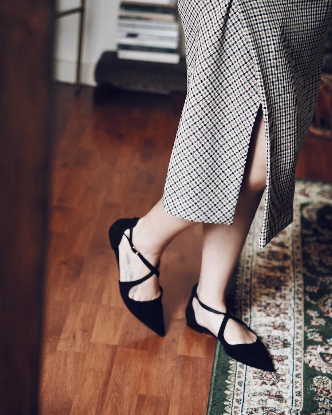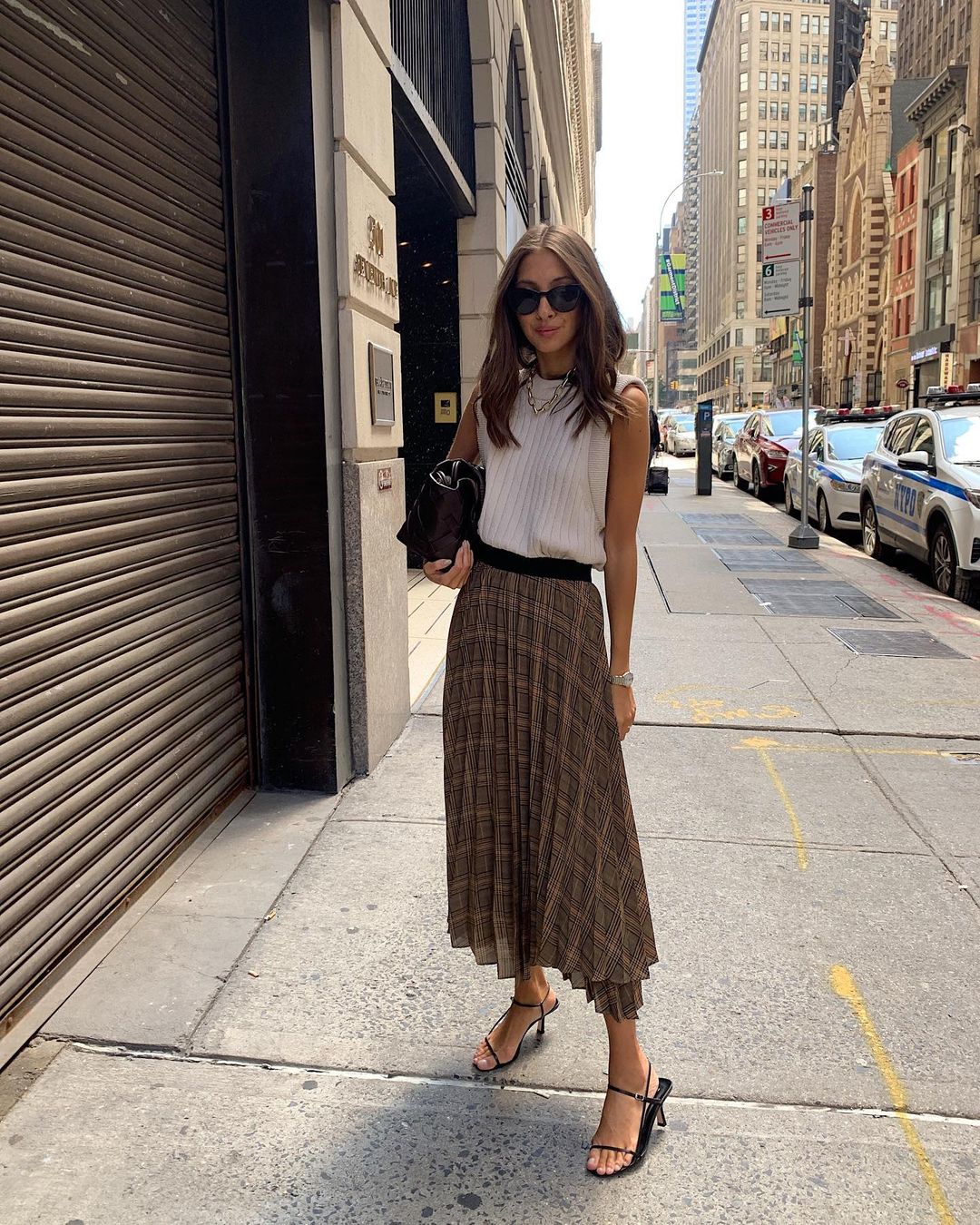 Style Blogger Alice Catherine wears a plaid skirt with strappy flats and high-waisted plaid trousers with black.