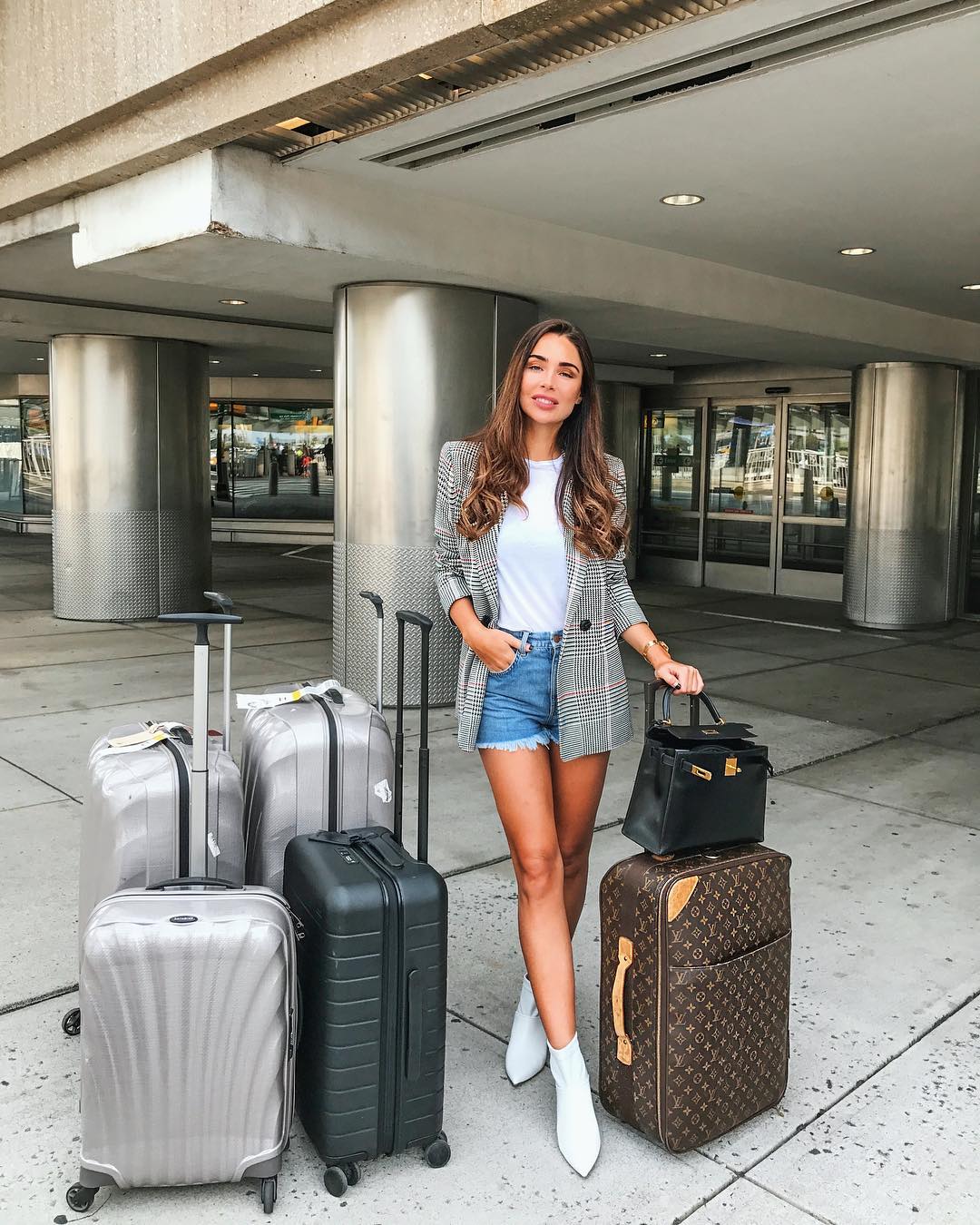 Felicia Akerstrom Ma (@fakerstrom), above. Left, London-based Style Blogger Johanna Emma Olsson (@johannaeolsson) showcases perfect airport style with a plaid blazer, denim cut-offs and ankle boots. See more of Johanna’s looks below.