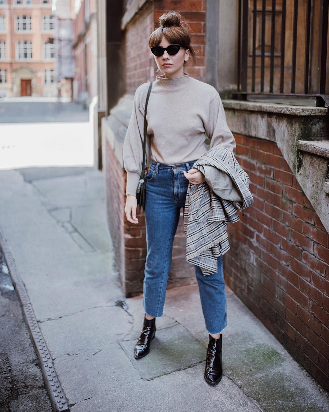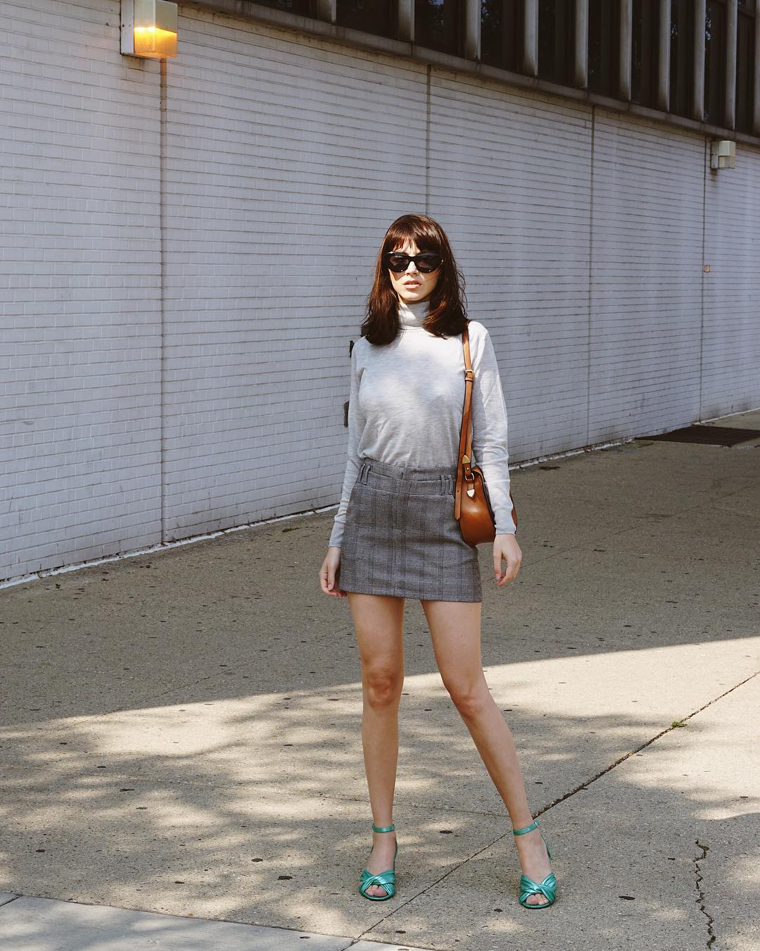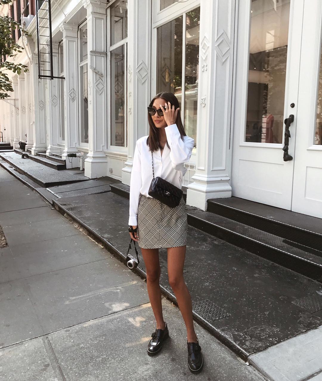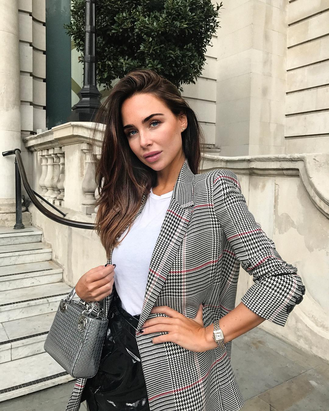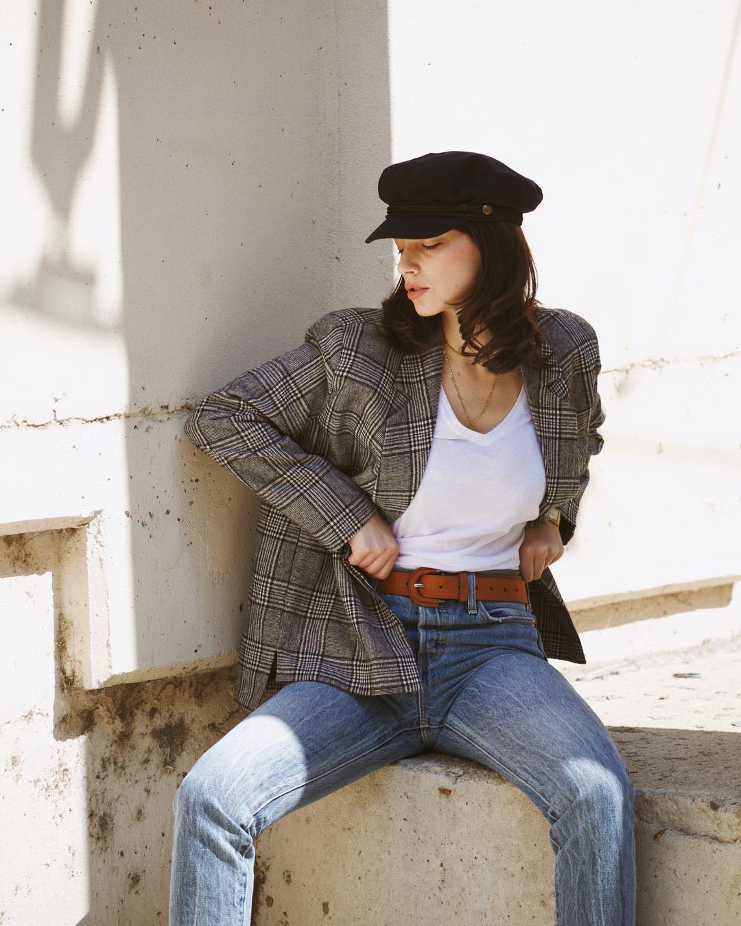 Above: Alexandra @saskaludilo wears a plaid mini with a turtleneck and green sandals. Left: Alexandra pairs a boxy plaid blazer with the classic combination of jeans and a white t-shirt, accessorizing with a belt and hat.