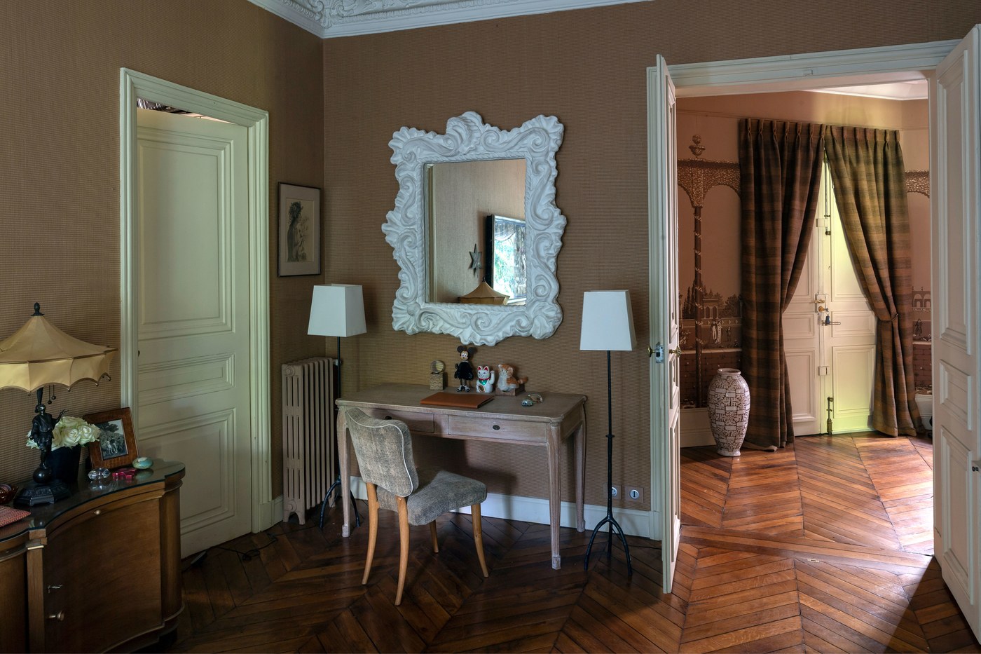 Special events & party planner Françoise Dumas’ Paris apartment has that time-worn, lived-in feel that’s difficult to replicate, both cosy and comfortable and sophisticated at once. The kind that cooly mixes Jacques Grange-designed sofas with 1930’s ceramics from the collection of Karl Lagerfeld. There’s plenty of leopard print, chevron flooring and a chic Serge Roche plaster mirror. There’s 19th-century panorama wallpaper of the Palais Royal in the entrance hall, and even a private garden. The décoration was done by Pierre Passebon, and the garden landscape by Louis Benech and Sébastien Habert.