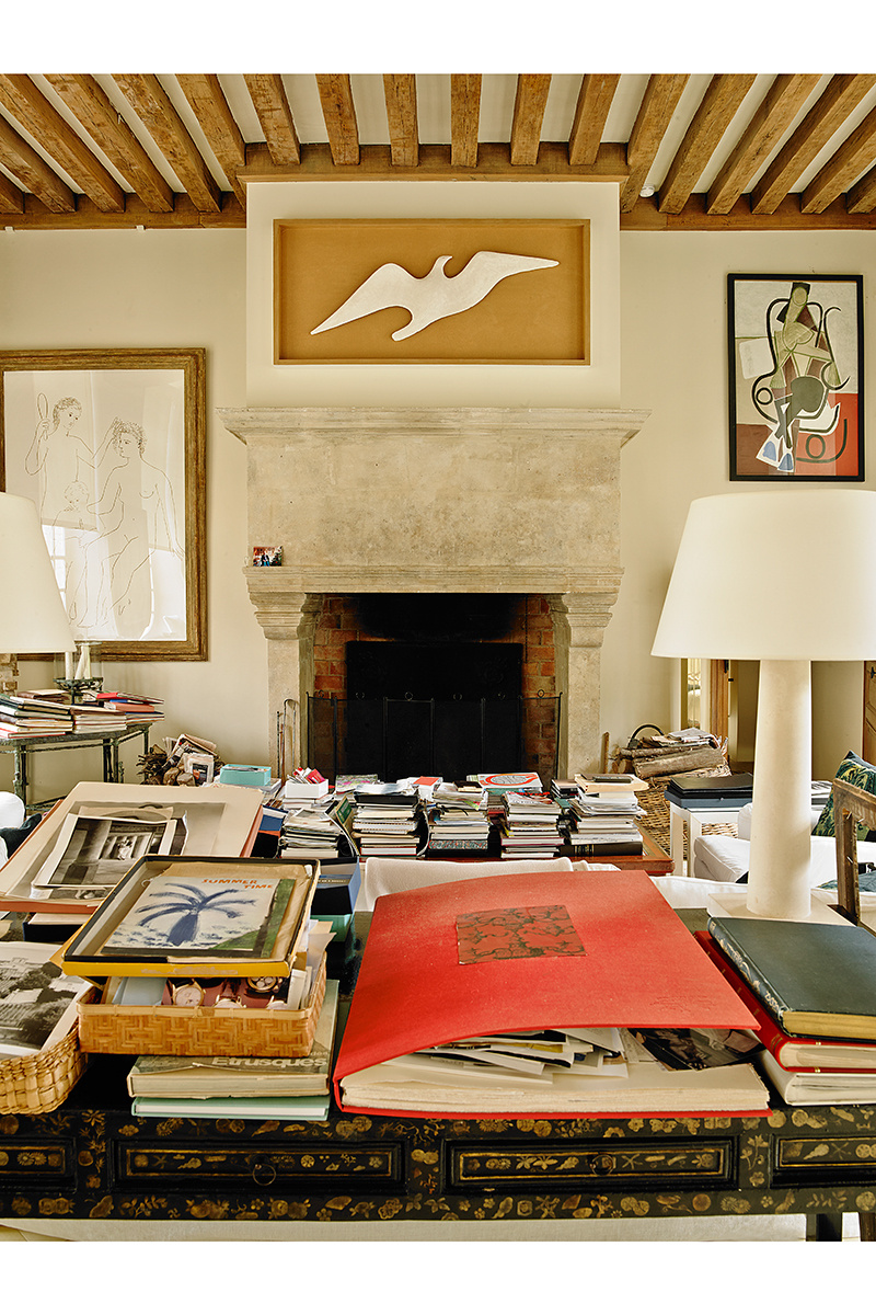“Tables are piled with decades of photographs, letters, momentos, sketches and personal caprices in the Givenchy’s studio. A bas-relief of a dove by Giacometti surmounts the fireplace.” From the Spanish edition of Vanity Fair; photography by Pablo Zamora. | (via The Art of the Room)