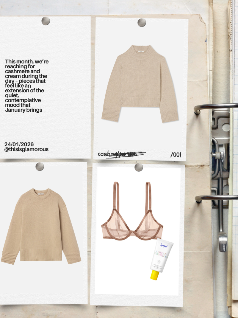 This month, we’re reaching for cashmere and cream during the day – pieces that feel like an extension of the quiet, contemplative mood that January brings. By evening, it’s all about stepping into black: tailored, refined, with just the right amount of gleam from gold jewellery and a bit of lengthening mascara. It’s a rhythm that feels right for this time of year – neutrals for daylight hours, black for evening, and pieces designed to live with you through these long January days and nights.