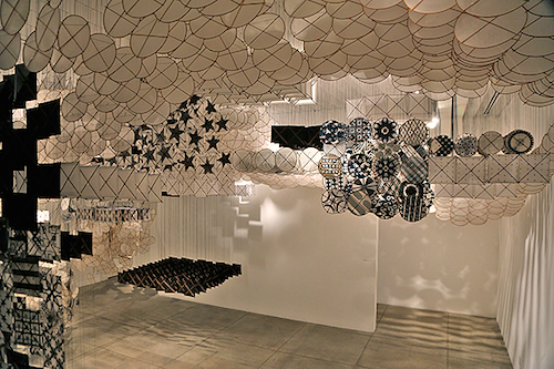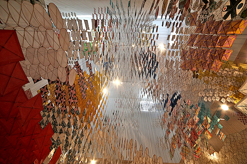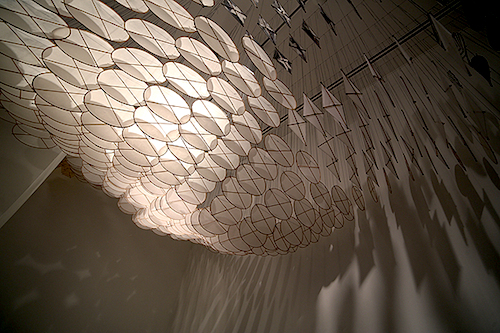 Hashimoto often creates wall hangings comprised of thousands of miniature kites (based on the traditional practices in Japan) and updates them by weaving together rice paper and bamboo slivers into complex designs, a unique process which entrances passersby as the illusion of space, light and motion are simultaneously shifted.