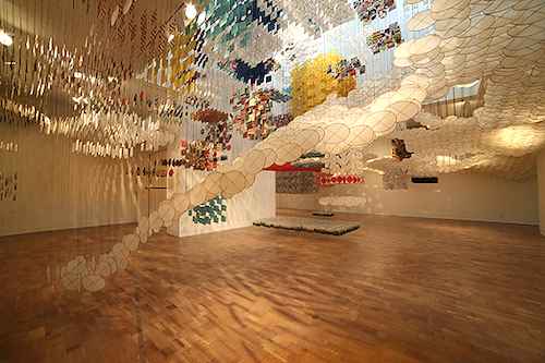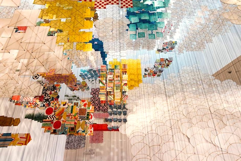 His latest project, displayed at the Museum of Contemporary Art (MOCA) in Los Angeles, continues his space-altering legacy. The third and final edition of a series titled “Gas Giant,” which has been previously exhibited in Venice’s Fondazione Querini Stampalia in 2013 and Chicago’s Rhona Hoffman Gallery in 2002, Hashimoto has created an installation that spans three floors with the an assortment of paper kites.