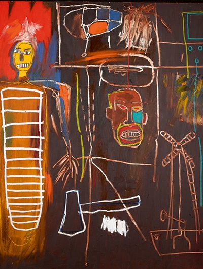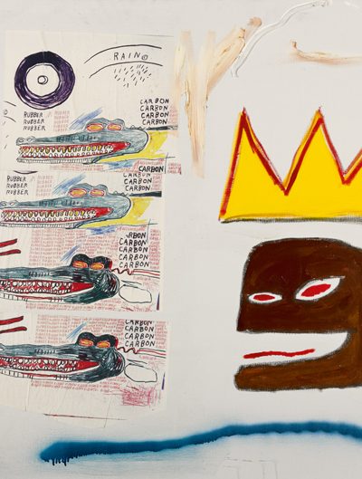 Untitled and Air Power were both acquired by David Bowie in 1995, the year before he played the iconic role of Andy Warhol in Julian Schnabel’s film Basquiat. Bowie would go on to show his admiration for the artist over the following years, first with an essay he wrote for Modern Painters in the spring of 1996, and in his 2001 essay for the anthology Writers On Artists. It is clear that Bowie felt a strong connection to the artist, stating “It comes as no surprise to learn that [Basquiat] had a not-so-hidden ambition to be a rock musician, his work relates to rock in ways that very few other visual artists get near.” (Modern Painters, 1996).