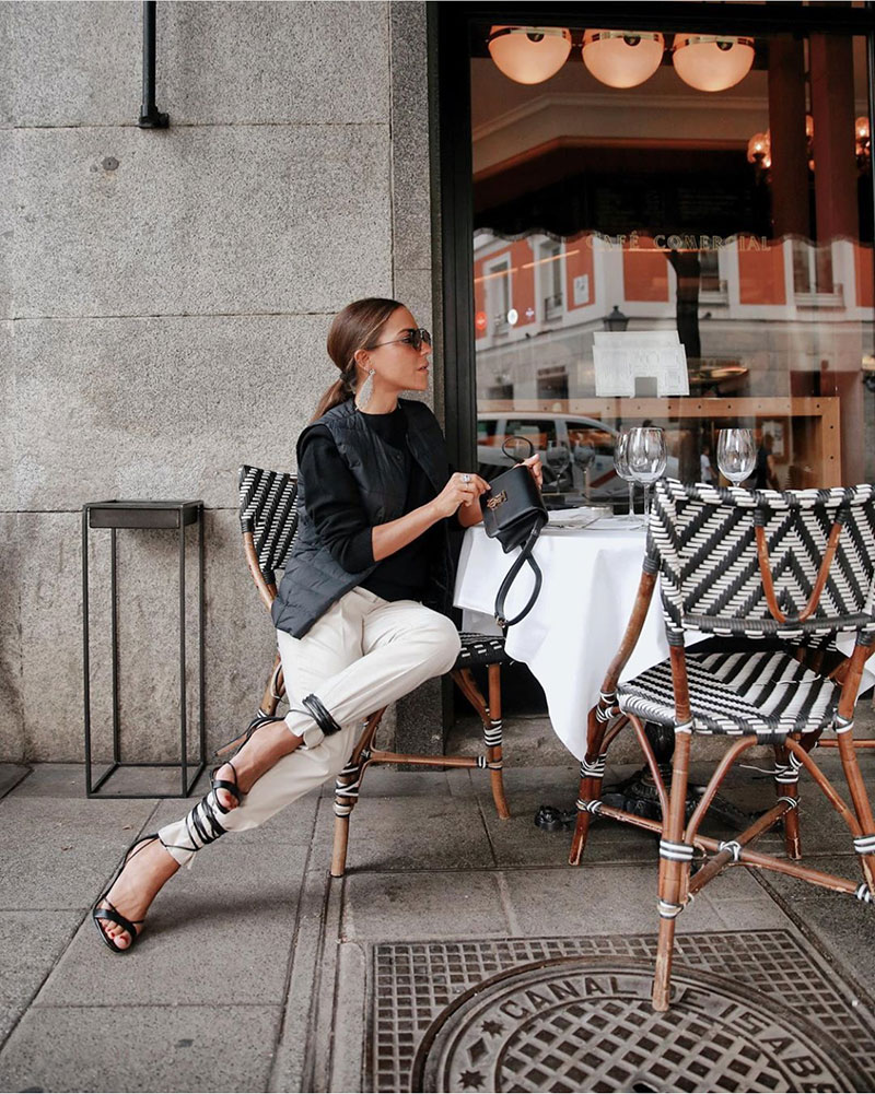 If you’re like us and thought anything puffy could only go with a chunky trainer, you’ll be as surprised as we were to see how well it can go with dangly earrings and a strappy sandal. Spanish blogger Paula Ordovás takes sporty chic to new heights by doing just that, and as well as keeping things simple in blacks and neutrals and glamourising things up a little with accessories.